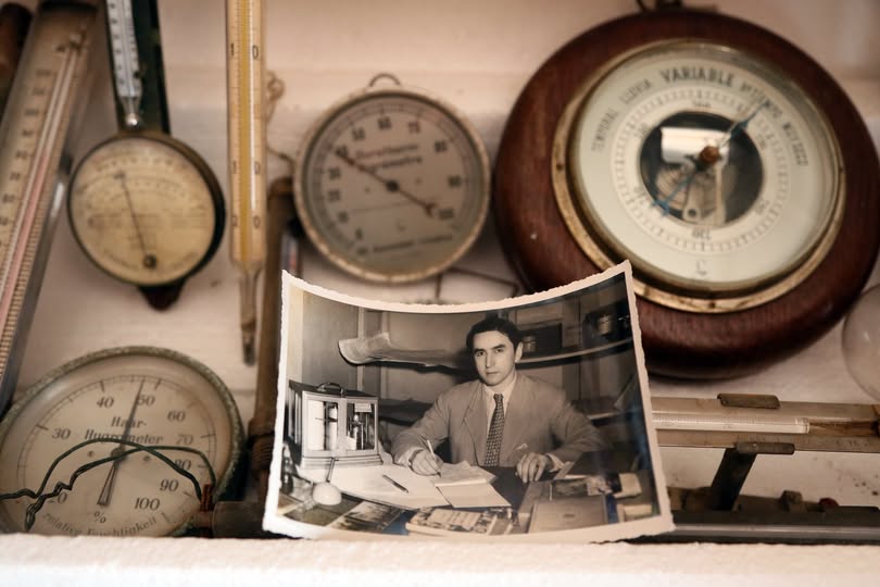 Foto de Muñoz Ferrada en sus inicios como astrónomo, junto a instrumentos de su laboratorio en su casa de Villa Alemana